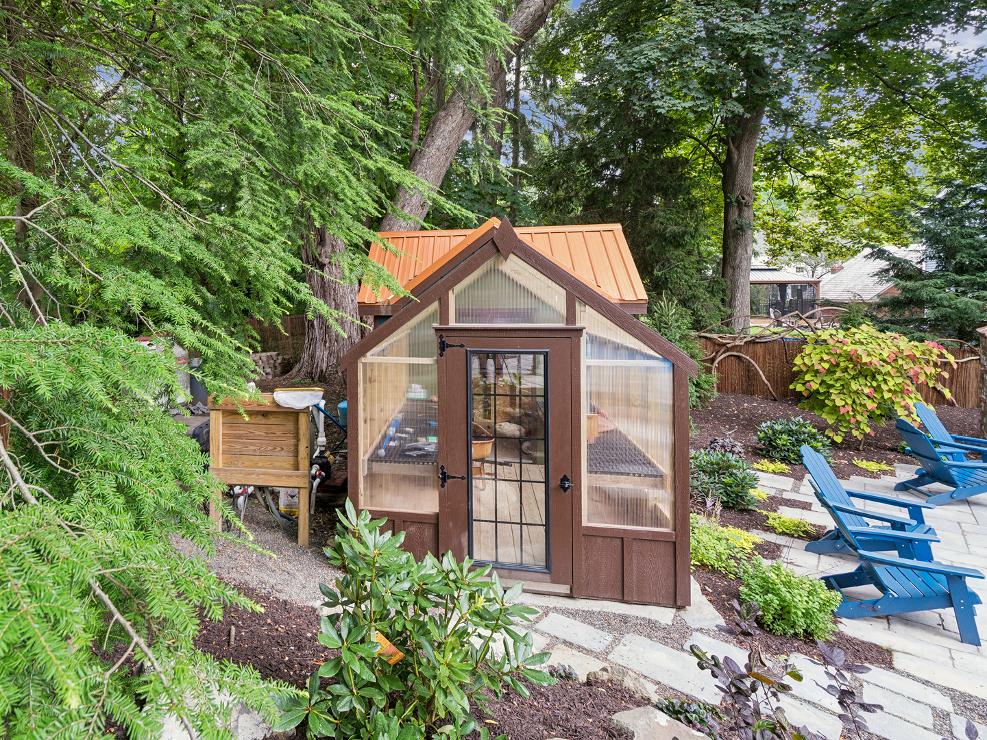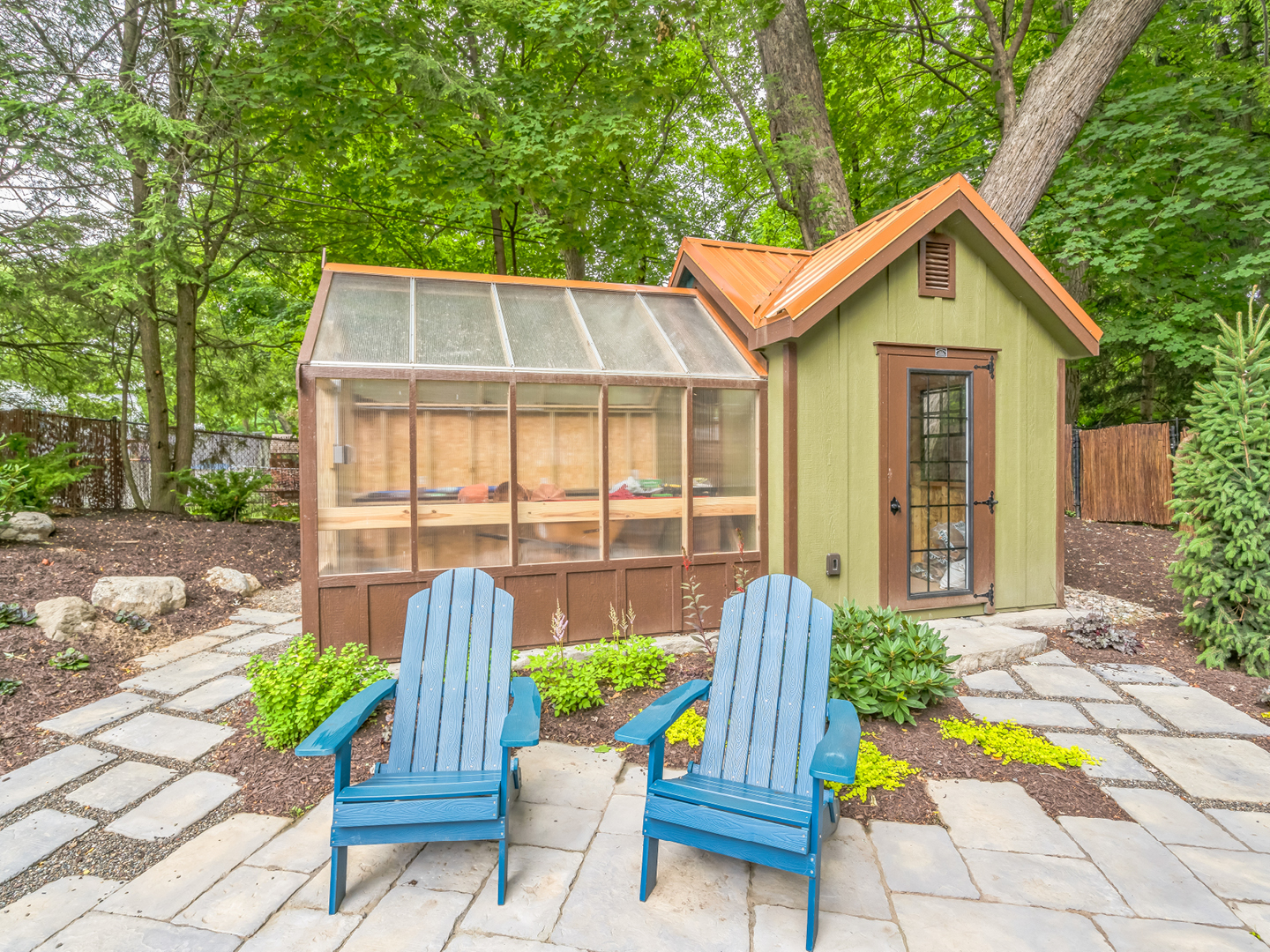 This charming 8×10 greenhouse with attached 6×10 storage shed is a gardener’s dream. Built with twin-wall polycarbonate panels for excellent insulation and light diffusion, it is the perfect way to extend your growing season while compromising on critical outdoor storage needs. Inside, built-in potting benches make planting and organizing easy, while the shed offers convenient storage for tools and supplies. With its rustic design, bright metal roof, and placement in a beautifully landscaped backyard, this structure blends functionality with style.