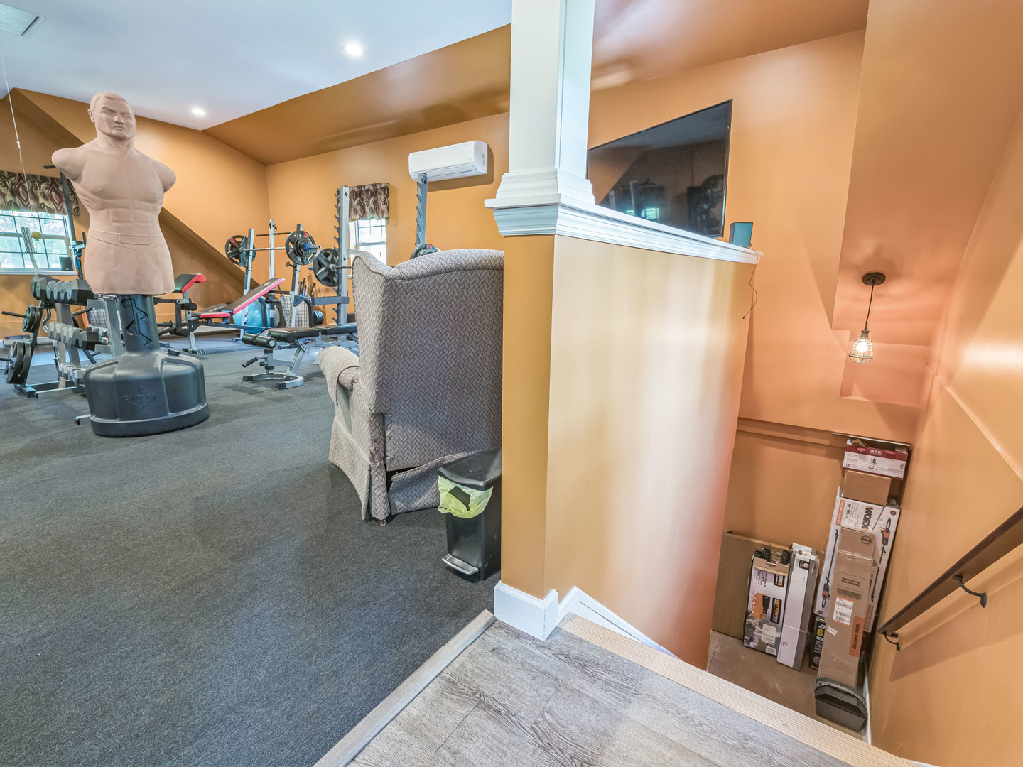 A lot of thought was put into this garage’s style. The exterior is finished with LP Board & Batten Siding, accented with LP shakes on the dormers and gables. The front was finished with the client’s stone. The client also finished out the interior to make it the perfect garage and home gym space.