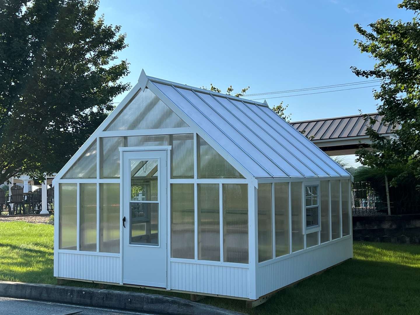 The A-frame has always been a popular design. Perhaps because of its concise footprint and affordability. Our design incorporates all the best of the best needs and wants with a full-size screen door, polycarbonate twin panels for durability and performance along with pretty as a picture wainscoting and practical electrical fan, and 24” potting benches.
