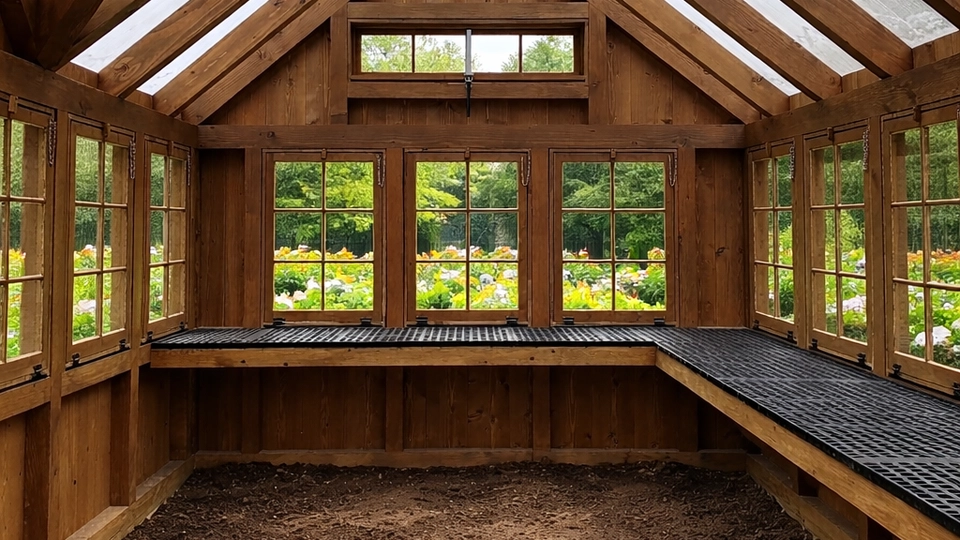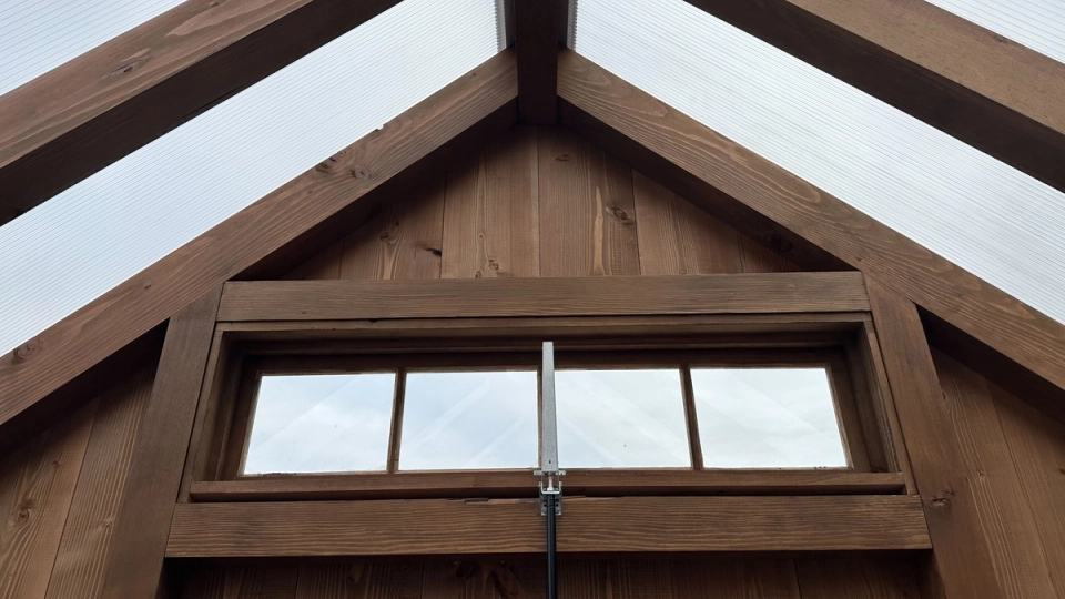 Gardening success starts with light, and the Chalet is designed to maximize it. The roof is clad in high‑clarity polycarbonate panels that allow abundant sunlight to enter while filtering harmful UV rays. These panels have a steep pitch to efficiently shed rain or snow, protecting your plants year‑round . Large wood‑framed windows line each side, flooding the interior with natural light and panoramic views. Many of these windows open to provide cross‑ventilation, and optional roof vents release excess heat. A lockable door with a transom window adds even more light while keeping the interior secure.