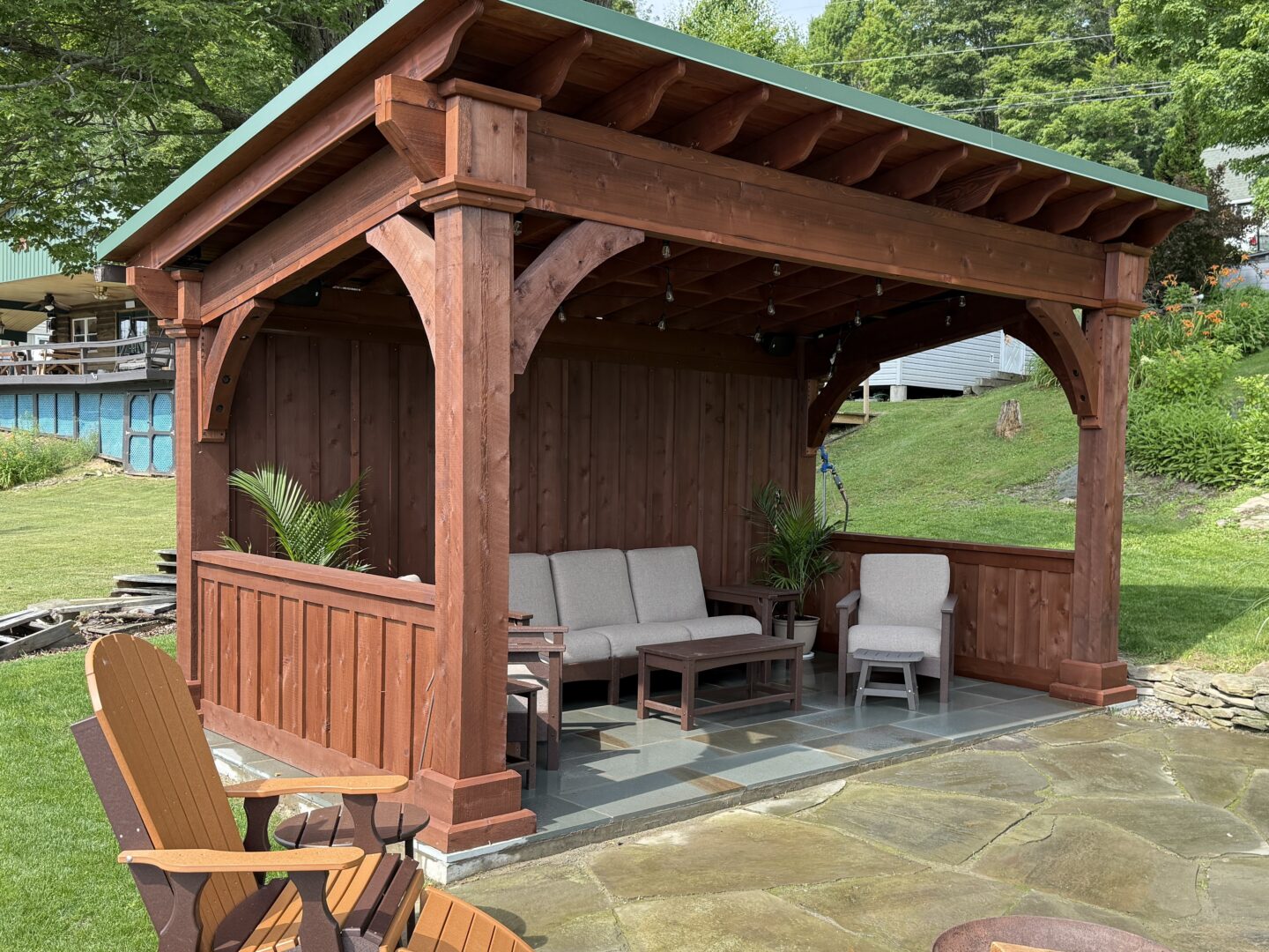 Your Wood or Vinyl Sante Fe Pavilion comes standard with 8×8″ posts and decorative post skirts. Large arched braces keep your unit solid and sturdy. The Santa Fe Pavilion showcases heavy-duty headers on all four sides to support the roof. The roof is constructed of 2×8″ joints and 1×6″ roof decking, and covered with a five-v-panel metal roofing. The underside of the vinyl pavilion roof comes standard with stained mahogany and the wood pavilions come unstained as standard.