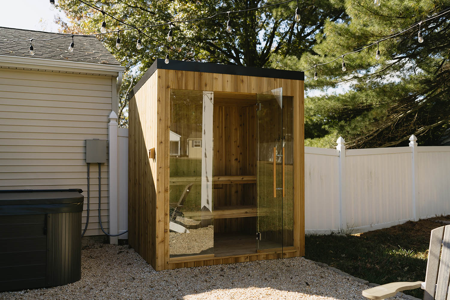 Inside, two–level cedar benches let you choose your preferred heat level, and a high–performance electric heater provides soft, consistent heat and abundant steam. The combination of premium cedar and tempered glass creates a modern, airy ambiance while the lean–to roof and ribbed metal roofing ensure the structure withstands rain, snow and changing seasons.
