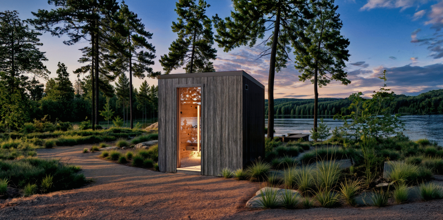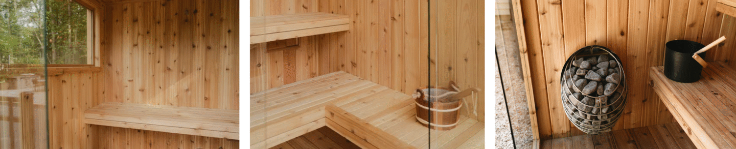 Stoltzfus Structures offers a couple of options when it comes to saunas, including the Harmony, Haven, and our NEW MODEL – Serenity. None of these saunas comes as a kit, but instead, are delivered fully built and ready to set up on your property. There are some electrical needs that you need to consider when placing a sauna on your property. Contact us to find out what your property needs if you’re considering a sauna. All these sauna options are great for year-round use due to their roof style, letting ice, snow, rain, and tree debris slide off easily. Add a stone walk path, string lights, and outdoor potted plants to make this sauna space your own stylish retreat. Take a walkthrough of one of our saunas to see some of the features
